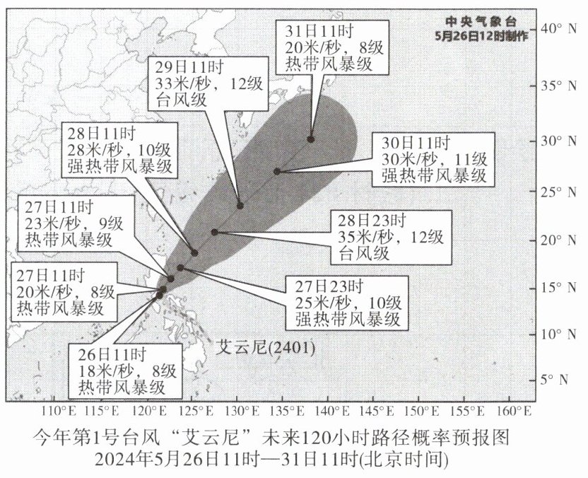 读2024年第1号台风“艾云尼”120小时内路径概率预报图,完成2~3题。
