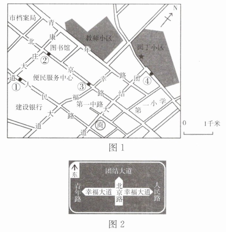 生活情境 读某市街区平面图和道路交通指示图,完成1~2题。