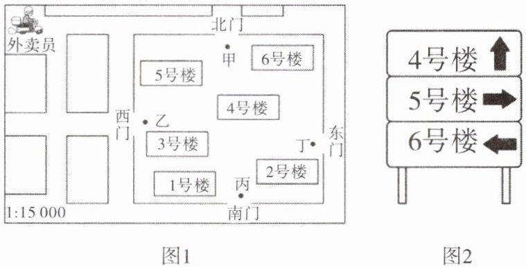 点外卖是现在年轻人常见的生活方式。读某小区及周边地区平面示意图(图1)和小区楼号指示牌(图2),完成3~4题。