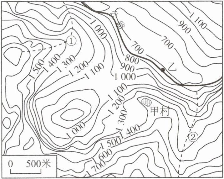 [2023广西改编]我国西部山区某地甲村地势险峻,村民进出需沿陡峭的山路攀爬。读甲村周边地区等高线地形示意图(单位:米),完成1~2题。