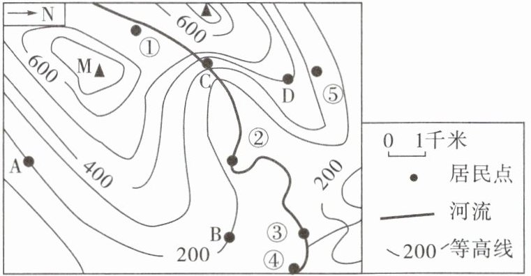 B.5个居民点中,位于鞍部位置的居民点是②