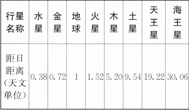 3. (教材 P7 活动改编)小行星带在火星和木星轨道之间,根据太阳系中的八大行星到太阳的距离(如表所示),据此推测小行星带到太阳的距离可能是( )