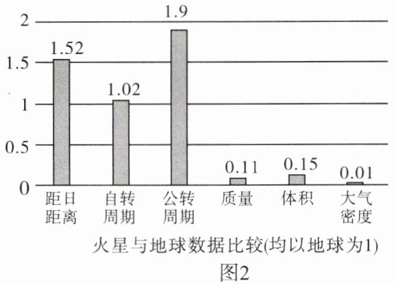 时事情境·火星探测 2020 年 7 月 23 日 12 时 41 分,“天问一号”火星探测器在文昌航天发射场发射成功,探测器飞行约 7 个月后抵达火星,迈出了我国自主开展行星探测的第一步。图 1 为太阳系“生命宜居带”示意图,图 2 为火星与地球数据对比图。读图,完成 1~2 题。