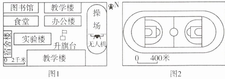 生活情境 学校即将举行运动会队形演练,为测试拍摄效果,小明利用无人机拍摄了两张照片后绘制成图。读校园平面图和操场平面图,完成3~4题。