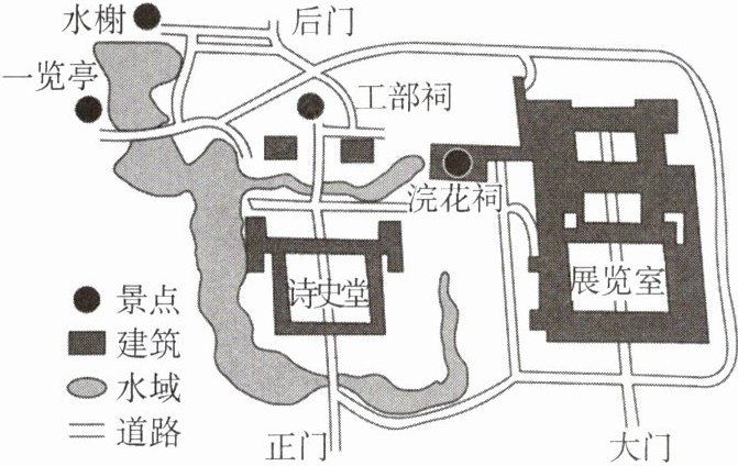 跨学科·语文 “安得广厦千万间,大庇天下寒士俱欢颜……”同学们在学习杜甫的诗词后,参观了杜甫草堂。读四川省成都市的杜甫草堂导游图,完成1~2题。