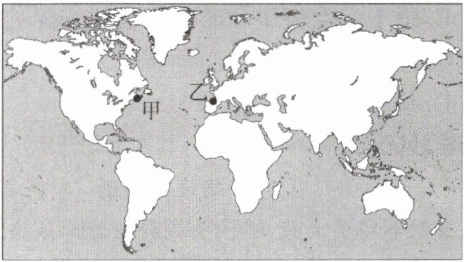 跨学科·生物有一种正蚯蚓(一种蚯蚓的名称)同时分布在图中同纬度的甲、乙两地,但与甲地同纬度同大陆的西海岸却并没有这种蚯蚓分布。读图,完成1~3题。