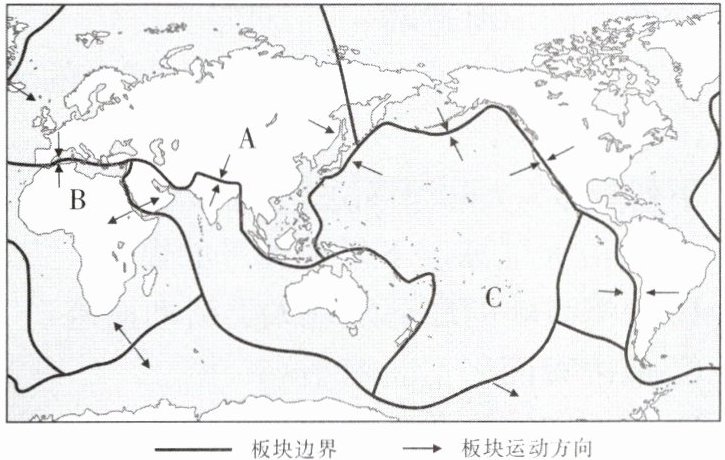 (3)图中我国所在的大洲位于A______板块,该板块和印度洋板块的______(碰撞挤压或张裂)形成了世界最高山脉——喜马拉雅山脉。