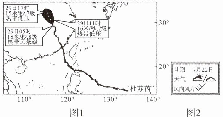 生活情境 2023 年 7 月 21 日,台风“杜苏芮”在菲律宾以东洋面生成,于 7 月 28 日登陆我国福建省沿海。图 1 为 7 月 22 日至 29 日“杜苏芮”移动路径图,图 2 为 7 月 22 日福建省宁德市沿海海区天气预报图。读图,完成 4~5 题。