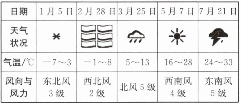 8. 天气与我们的生活密不可分,我们每天都在关注天气变化情况。读某年徐州某校兴趣小组做的天气情况记录表(部分),完成下列要求。