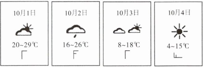 生活情境 天气影响人们的生产和生活,读合肥某年国庆节期间连续四天的天气预报示意图,完成 6~7 题。