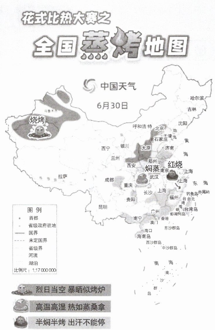 4. (教材 P70 活动改编)天气预报不仅可以帮助我们了解未来一段时间的天气,而且可以对我们的生活给出提示。下图为 2024 年 6 月 30 日全国蒸烤地图,请你根据该图,拟写一篇巧妙应对高温天的生活小技巧。