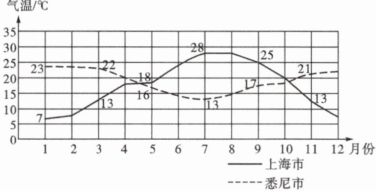 例 1 读上海和悉尼某年各月气温统计图,从图中的气温曲线可知( )