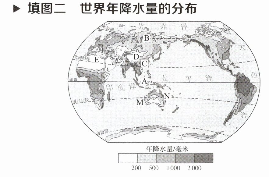 3. M、N两地相比,年降水量更多的是______地,这说明在回归线附近,大陆______岸的降水更多。
