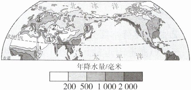 (2)对比①②③地年降水量的差异,归纳世界降水的分布特点是( )