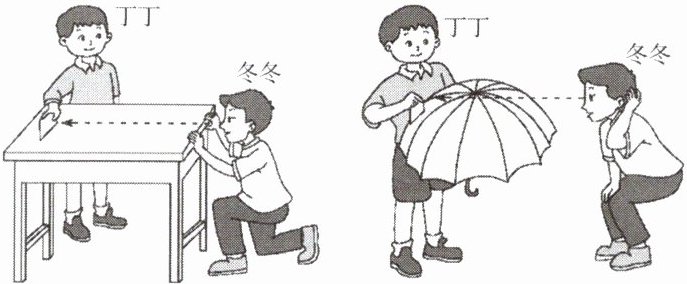[2023 益阳期中]如图,丁丁和冬冬在进行地理实验探究,丁丁手持小船模型分别沿着桌面和伞面(小船不脱离桌面或伞面)逐渐向冬冬靠近或远离,据此完成 1~2 题。