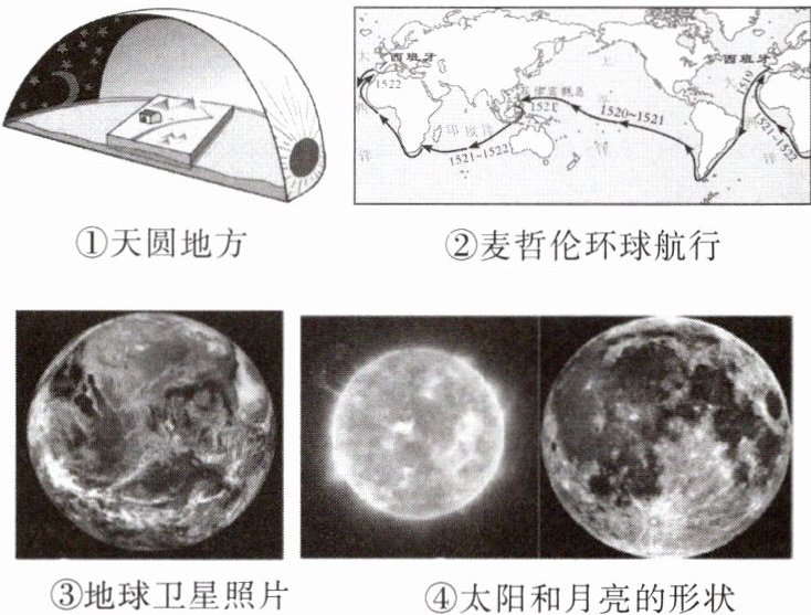 1. 如今,航天员在太空中能够清晰地看到地球的形状是球体。从我国古代“天圆地方”的说法,到观测月食、完成环球航行,人类对地球形状认识的过程,依次经历了( )