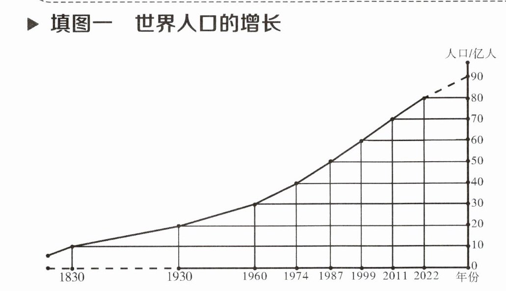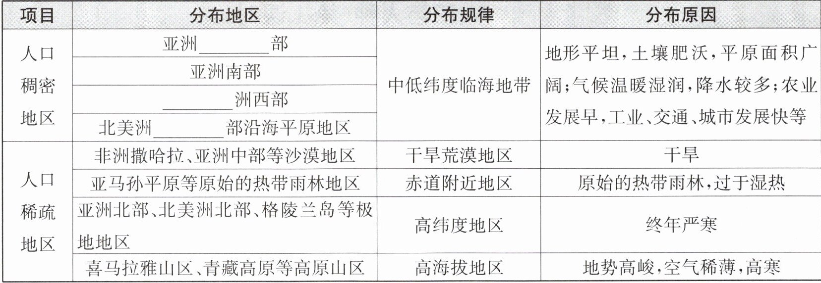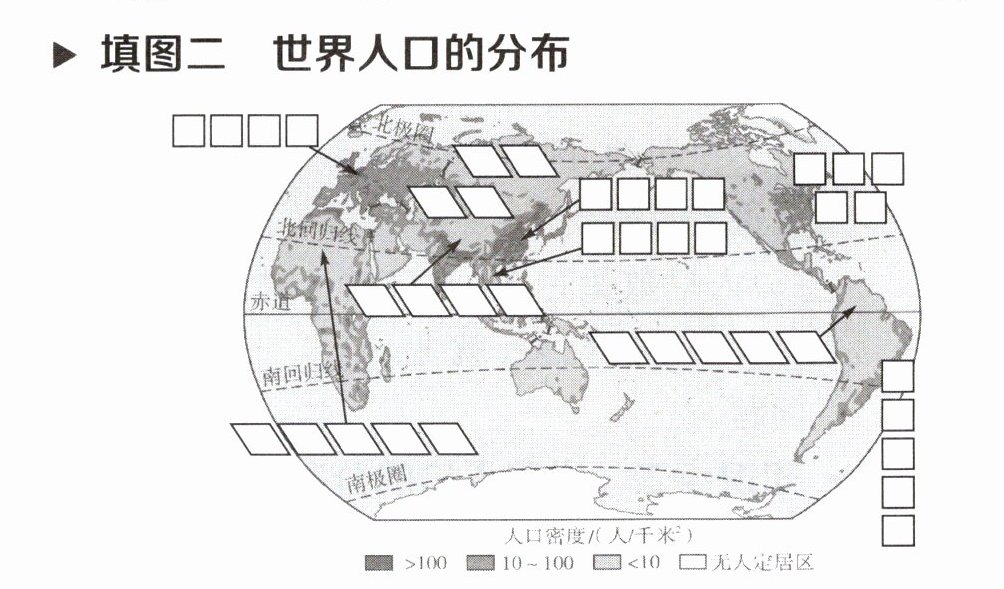 1. 在“□”里填写世界人口稠密区:亚洲东部、亚洲南部、欧洲西部、北美洲东部、南美洲东部。
