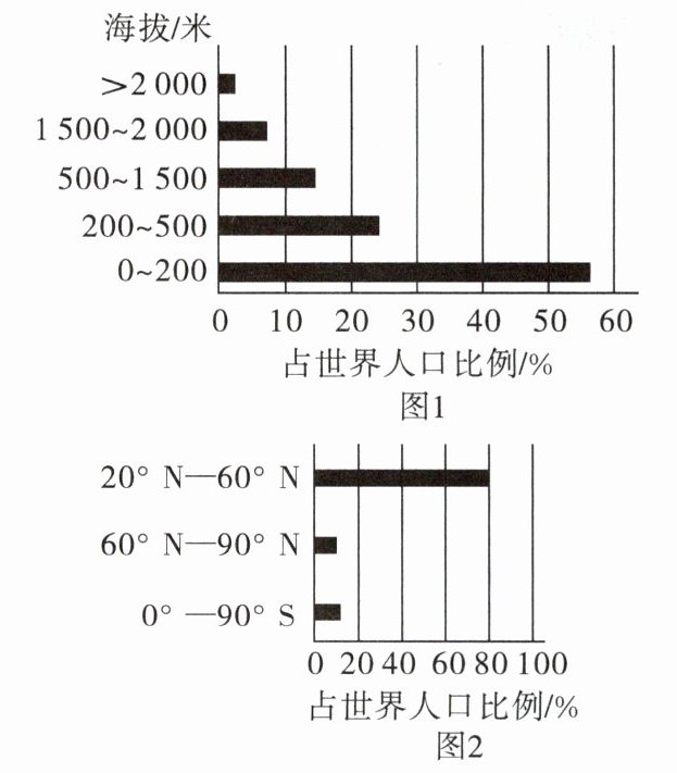 读不同海拔的世界人口分布比例图(图1)和不同纬度的世界人口分布比例图(图2),完成1~2题。
