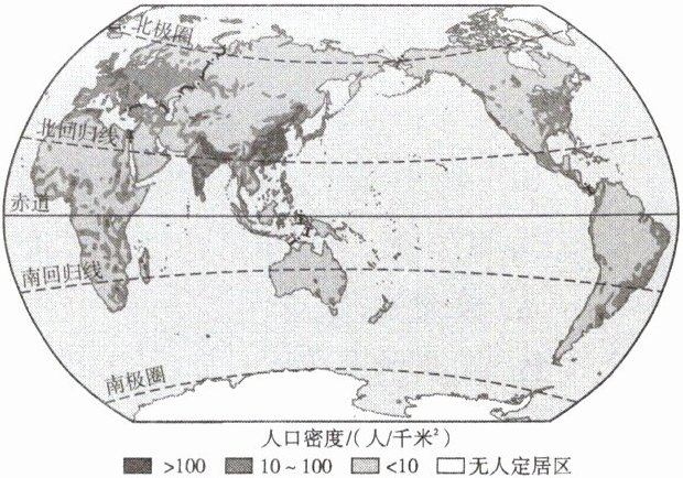 [2024四川模拟]人口分布和地理环境密切相关。读世界人口分布图,完成5~7题。