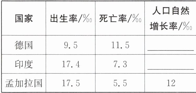 (1)分别计算德国、印度该年的人口自然增长率,填在表格中。