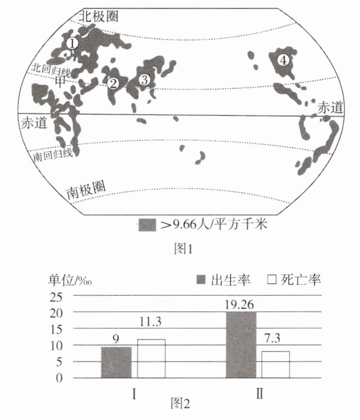 (1)据图1分析,从半球位置看,世界人口主要分布在______(填“南”或“北”)半球,人口稠密地区自然环境的共同特点:①纬度位置:__________;②海陆位置:__________。