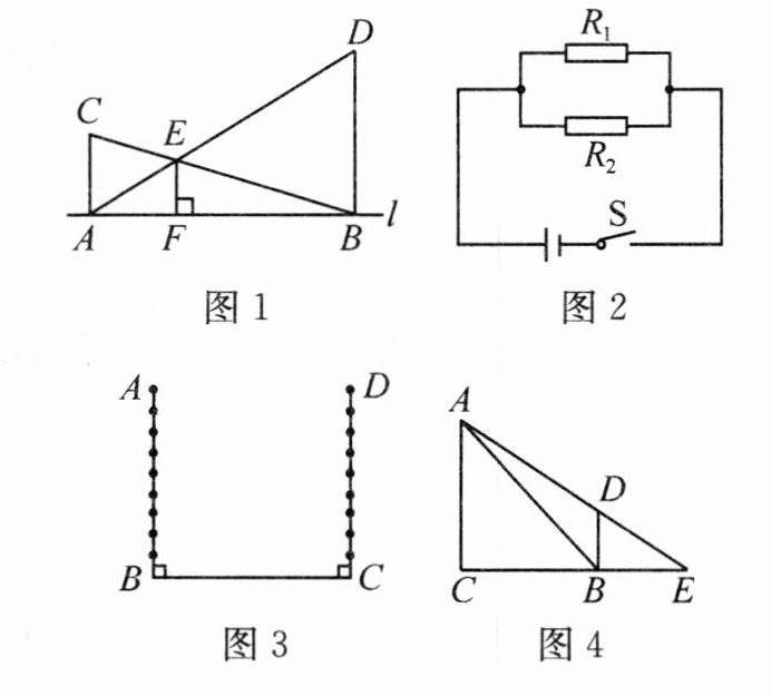 如图 1,在直线$l$上任取两点$A$、$B$,分别过点$A$、$B$作直线$l$的垂线,并在这两条垂线上分别截取$AC = R_{1}$,$BD = R_{2}$,且点$C$、$D$位于直线$l$的同侧,连结$AD$、$BC$交于点$E$,过点$E$作$EF\perp l$,则线段$EF$的长度就是并联后的电阻值$R$.