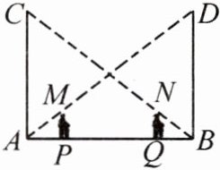 4. (模型观念)如图,王华同学在晚上从路灯电杆 $ AC $ 走向路灯电杆 $ BD $,当他走到点 $ P $ 时,发现他身后的影子的顶端刚好接触到 $ AC $ 的底部,当他再向前步行 $ 12 \, m $ 到达点 $ Q $ 时,发现他身前的影子的顶端刚好接触到 $ BD $ 的底部。已知王华同学的身高是 $ 1.6 \, m $,两个路灯的高度都是 $ 9.6 \, m $。