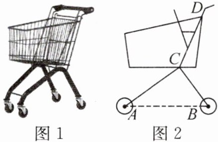1. 图 1 是购物车模型,图 2 为其侧面示意图,测得支架 $ AC = 24 \, cm $,$ CB = 18 \, cm $,两轮中心的距离 $ AB = 30 \, cm $,求点 $ C $ 到 $ AB $ 的距离。(结果保留整数)