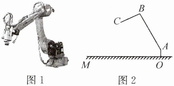 6.(应用意识)[2024·忻州模拟]随着科学技术的不断发展,自动机器人用于生产、生活的技术日益成熟。如图1是一款自动焊接机器人,主要负责焊接、切割或热喷涂等工作。图2是该自动焊接机器人在工作状态下的示意图,底座$OA$与地面垂直且可根据需要进行移动,$AB$、$BC$为机械臂,$OA = 1m$,$AB = 6m$,$BC = 3m$,$\angle OAB = 150^{\circ}$,$\angle ABC = 95^{\circ}$。求机械臂端点$C$到地面$OM$的距离。(结果精确到$0.1m$;参考数据:$\sin 25^{\circ}\approx 0.42$,$\cos 25^{\circ}\approx 0.91$,$\tan 25^{\circ}\approx 0.47$,$\sqrt{3}\approx 1.73$)