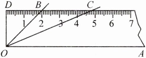 2. [2023·牡丹江]如图,将 $45^{\circ}$ 的 $\angle AOB$ 按下面的方式放置在一把刻度尺上;顶点 $O$ 与尺下沿的端点重合,$OA$ 与尺下沿重合,$OB$ 与尺上沿的交点 $B$ 在尺上的读数恰为 $2cm$. 若按相同的方式将 $22.5^{\circ}$ 的 $\angle AOC$ 放置在该刻度尺上,则 $OC$ 与尺上沿的交点 $C$ 在尺上的读数为__________ $cm$.(结果保留根号)
