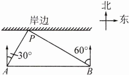 3. 水务人员为考察水情,乘快艇以 $10m/s$ 的速度沿平行于岸边的航线 $AB$ 由西向东行驶. 如图,在 $A$ 处测得岸边一建筑物 $P$ 在北偏东 $30^{\circ}$ 方向上,继续行驶 $40s$ 到达 $B$ 处,测得建筑物 $P$ 在北偏西 $60^{\circ}$ 方向上,则建筑物 $P$ 到航线 $AB$ 的距离为______ $m$.(结果保留根号)