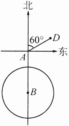5. (应用意识)[2024·柯城区期中]如图,一艘轮船以 $20$ 海里/小时的速度由西向东航行,在途中接到台风警报,台风中心正以 $40$ 海里/小时的速度由南向北移动,距台风中心 $20\sqrt{10}$ 海里的圆形区域内(包括边界)都属于台风区,当轮船到达 $A$ 处时,测得台风中心移动到位于 $A$ 处正南方的 $B$ 处,且 $AB = 100$ 海里.