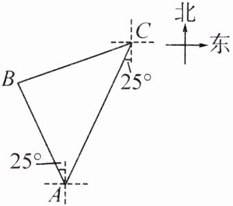 4. [2024·翼城县一模]周末,小红和小宇相约一起去郊外劳动基地参加劳动. 已知小红家 $B$ 在小宇家 $A$ 的北偏西 $25^{\circ}$ 方向上,且 $AB = 5km$. 两人到达劳动基地 $C$ 后,发现小宇家 $A$ 在劳动基地 $C$ 的南偏西 $25^{\circ}$ 方向上,小红家 $B$ 在劳动基地 $C$ 的南偏西 $70^{\circ}$ 方向上. 求小宇家 $A$ 到劳动基地 $C$ 的距离 $AC$.(结果保留 $1$ 位小数;参考数据:$\sin50^{\circ}\approx0.77$,$\cos50^{\circ}\approx0.64$,$\tan50^{\circ}\approx1.19$,$\sqrt{2}\approx1.41$)