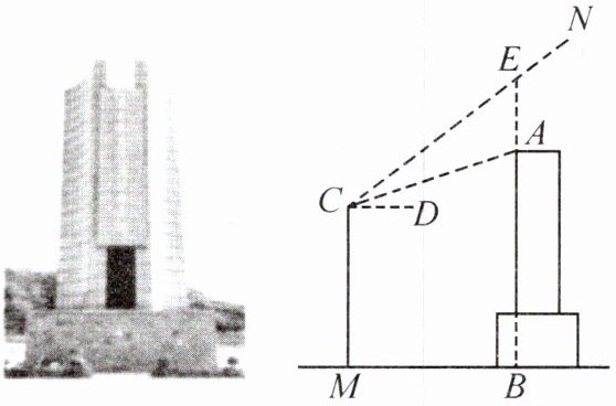 【数据采集】如图,点A是纪念碑顶部一点,AB的长表示点A到水平地面的距离.无人机从纪念碑前水平地面的点M处竖直上升,飞行至距离地面20m的点C处时,测得点A的仰角∠ACD=18.4°,然后沿CN方向继续飞行,飞行方向与水平线的夹角∠NCD=37°,当到达点A正上方的点E处时,测得AE=9m.