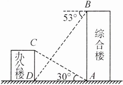例1 在一次数学课外实践活动中,小明所在的学习小组从综合楼顶部B处测得办公楼底部D处的俯角是53°,从综合楼底部A处测得办公楼顶部C处的仰角是30°,已知综合楼高24米,请你帮小明求出办公楼的高度.(结果精确到0.1;参考数据:tan37°≈0.75,tan53°≈1.33,√3≈1.73)
