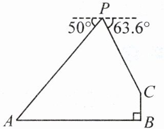 2. [2024·泰安]在综合实践课上,数学兴趣小组用所学数学知识测量大汶河某河段的宽度.他们在河岸一侧的瞭望台上放飞一只无人机.如图,无人机在河上方距水面高60m的点P处测得瞭望台正对岸A处的俯角为50°,测得瞭望台顶端C处的俯角为63.6°.已知瞭望台BC高12m(图中点A、B、C、P在同一平面内,A、B在同一直线上),则大汶河此河段的宽AB为______m.(参考数据:sin40°≈3/5,sin63.6°≈9/10,tan50°≈6/5,tan63.6°≈2)