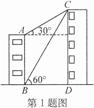1. [2024·德阳]某校学生开展综合实践活动,测量一建筑物CD的高度,在建筑物旁边有一高度为10m的小楼房AB,小李同学在小楼房楼底B处测得C处的仰角为60°,在小楼房楼顶A处测得C处的仰角为30°(AB、CD在同一平面内,点B、D在同一直线上),则建筑物CD的高为( )