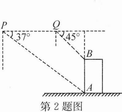 2. [2024·盐城]如图,小明用无人机测量教学楼的高度,将无人机垂直上升至距离地面30m的点P处,测得教学楼底端点A的俯角为37°,再将无人机沿教学楼方向水平飞行26.6m至点Q处,测得教学楼顶端点B的俯角为45°,则教学楼AB的高度约为______m.(精确到1m;参考数据:sin37°≈0.60,cos37°≈0.80,tan37°≈0.75)