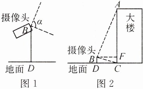5. [2024·兴县模拟]高空抛物极其危险,某小区为了防止高空抛物,特安装一批摄像头.图1是某型号的摄像头安装完成后的示意图,镜头的拍摄广角α=90°,摄像头B到地面的距离BD=2.7m.图2是安装完成后投入使用的示意图,当摄像头刚好能拍摄到大楼底部C时,同时也能拍摄到大楼上最高点A.此时,测角仪在点B处测得点C的俯角∠CBF=15°,点A、B、C、D、F均在同一平面内.请根据以上测量数据,求摄像头能拍摄到的大楼上最高点A到大楼底部点C的距离AC.(结果精确到1m;参考数据:sin15°≈0.26,cos15°≈0.97,tan15°≈0.27)