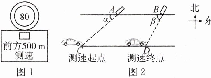 4. [2024·长子县期末]图1是某条道路的限速提示牌,该段道路限速80km/h(约22.2m/s).图2是小汽车途径该路段时,测速摄像头测速的示意图,点A、B在同一条水平直线上,且点A和点B到直线CD的距离都是8m,AB=800m,小汽车由西向东行驶,到达测速起点C时,点A处的摄像头测得车头俯角α=40°,经过37s小汽车到达测速终点D,点B处的摄像头测得车头俯角β=60°.点C、D在同一水平直线上,点A、B、C、D在同一平面内.请你通过计算判断该小汽车的平均速度是否超速.(结果精确到0.1m/s;参考数据:sin40°≈0.64,cos40°≈0.77,tan40°≈0.84,√3≈1.73)