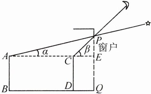 6. 中国的探月工程激发了同学们对太空的兴趣.某晚,淇淇在家透过窗户的最高点P恰好看一颗星星,此时淇淇距窗户的水平距离BQ=4m,仰角为α;淇淇向前走了3m后到达点D,透过点P恰好看月亮,仰角为β,如图是示意图.已知淇淇的眼睛与水平地面BQ的距离AB=CD=1.6m,点P到BQ的距离PQ=2.6m,AC的延长线交PQ于点E.(图中所有点均在同一平面内)