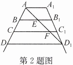 2. 如图是一架梯子的示意图,其中 $ AA_1 // BB_1 // CC_1 // DD_1 $,且 $ AB = BC = CD $. 为使其更稳固,在 $ A $、$ D_1 $ 间加绑一条安全绳(线段 $ AD_1 $),量得 $ AE = 0.4 \, m $,则 $ AD_1 = $______ $ m $.