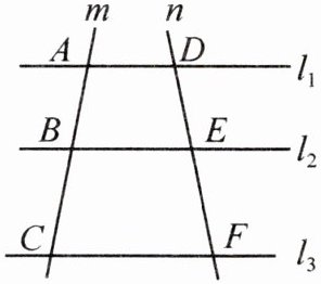 3. [2025·松江区一模]如图,已知直线 $ l_1 $、$ l_2 $、$ l_3 $ 分别与直线 $ m $ 交于点 $ A $、$ B $、$ C $,与直线 $ n $ 交于点 $ D $、$ E $、$ F $. 若 $ l_1 // l_2 // l_3 $,$ AB = \frac{2}{3}BC $,$ DF = 10 $,求 $ DE $ 的长.