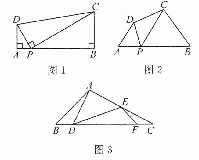 在$\triangle ADP$和$\triangle BPC$中,$\left\{\begin{array}{l}\angle A=\angle B\\\angle ADP=\angle BPC\end{array}\right.$。