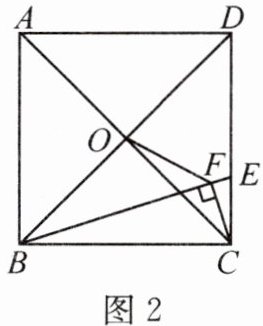 (3)如图 2,在正方形$ABCD$中,点$O$是对角线$AC$、$BD$的交点,点$E$在$CD$上,过点$C$作$CF \perp BE$于点$F$,连结$OF$,求证:$BO \cdot BD = BF \cdot BE$;