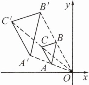 3. [2024·浙江]如图,在平面直角坐标系中,$\triangle ABC$ 与 $\triangle A'B'C'$ 是位似图形,位似中心为点 $O$。若点 $A(-3,1)$ 的对应点为 $A'(-6,2)$,则点 $B(-2,4)$ 的对应点 $B'$ 的坐标为( )