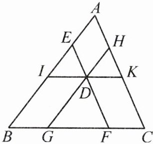 4. [2024·宜宾期末]如图,在$\triangle ABC$中,已知$EF// AC$,$GH// AB$,$IK// BC$. 请写出图中所有和$\triangle DGF$相似的三角形,并选一对加以证明.