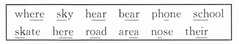 1.where;bear;their 2.sky;school;skate 3.hear;here;area 4.phone;road;nose