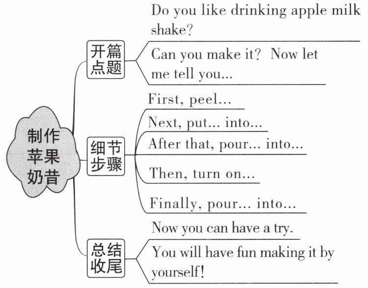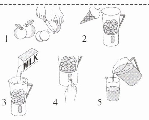 Step 3 1. milk shake 2. cut them up; mix them up; turn on 3. have a try Step 5 1. Do you know how to make it? 2. I believe you will have fun making it by yourself!