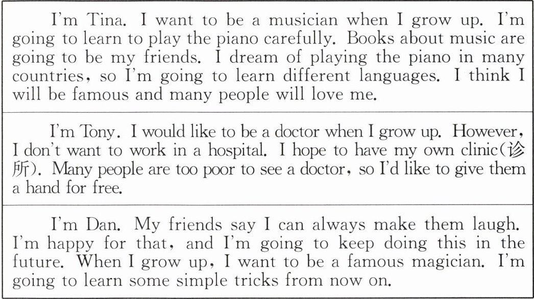 I'm Tony. I would like to be a doctor when I grow up. However, I don't want to work in a hospital. I hope to have my own clinic (诊所). Many people are too poor to see a doctor, so I'd like to give them a hand for free.